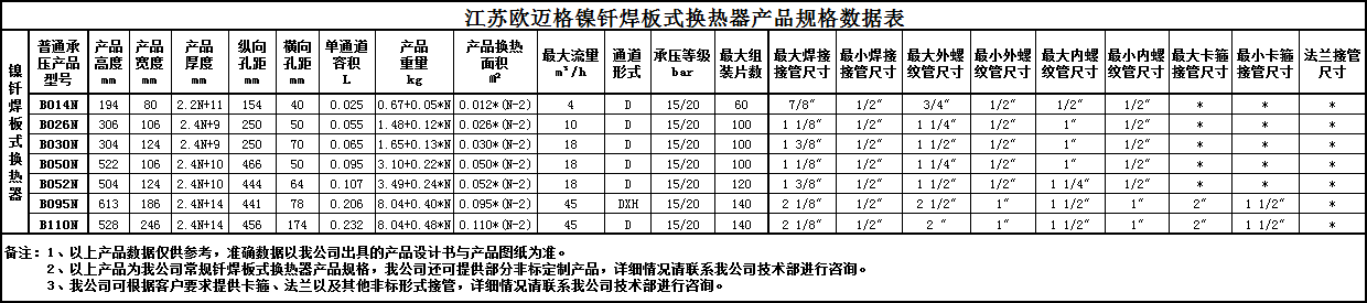 江蘇歐邁格鎳釬焊板式換熱器產品規格數據表